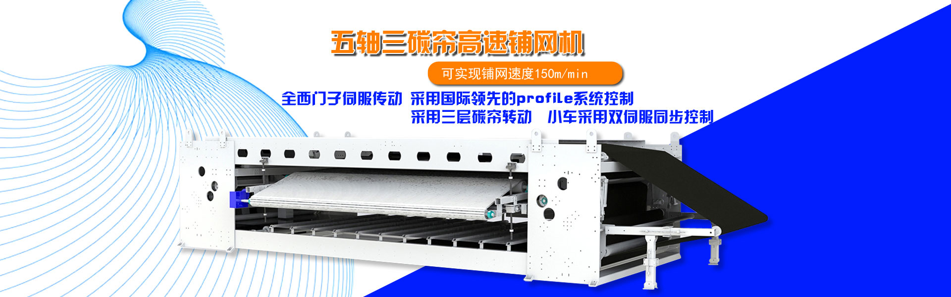 現(xiàn)公司主要供應設(shè)備:開包機、開松機、混棉機、給棉機、梳理機、鋪網(wǎng)機、氣流成網(wǎng)機、牽伸機、針刺機、起絨機、提花機、水刺機、熱熔烘箱、噴膠紡絲棉烘箱、收卷機……其中針刺機最寬11m,梳理機最寬3.5m,鋪網(wǎng)機速度130m/min;
